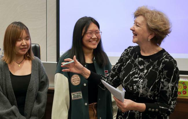 Исполняющий обязанности заведующего кафедрой русского языка, культуры речи и методики обучения Елена Щербинина и профессор Ольга Колесникова познакомили преподавателей и старшекурсников из Китая с активными методиками изучения русского языка как иностранного. Елена Васильевна показала, как на всех уровнях занятия – от вступления до повторения пройденного материала, приобретения новых знаний, отработки умений, формирования навыков, рефлексии – можно использовать приёмы, активизирующие умственные, творческие, духовно-нравственные качества обучающихся. Ольга Ивановна продемонстрировала игровые методики по изучению языка: «Русское грамматическое лото», «Синтаксическое домино», «Лингвистический снежный ком» и «Конструирование поэтического текста». Китайские коллеги в ходе текстовой деятельности создали поэтические произведения по мотивам стихотворений Сергея Есенина.