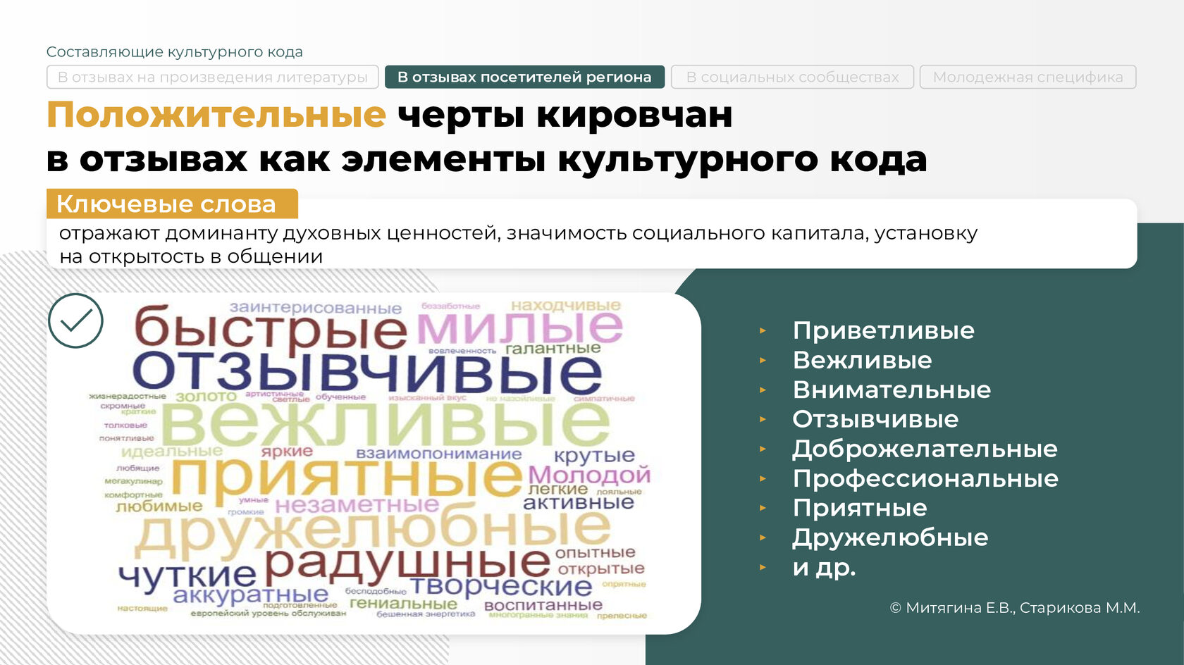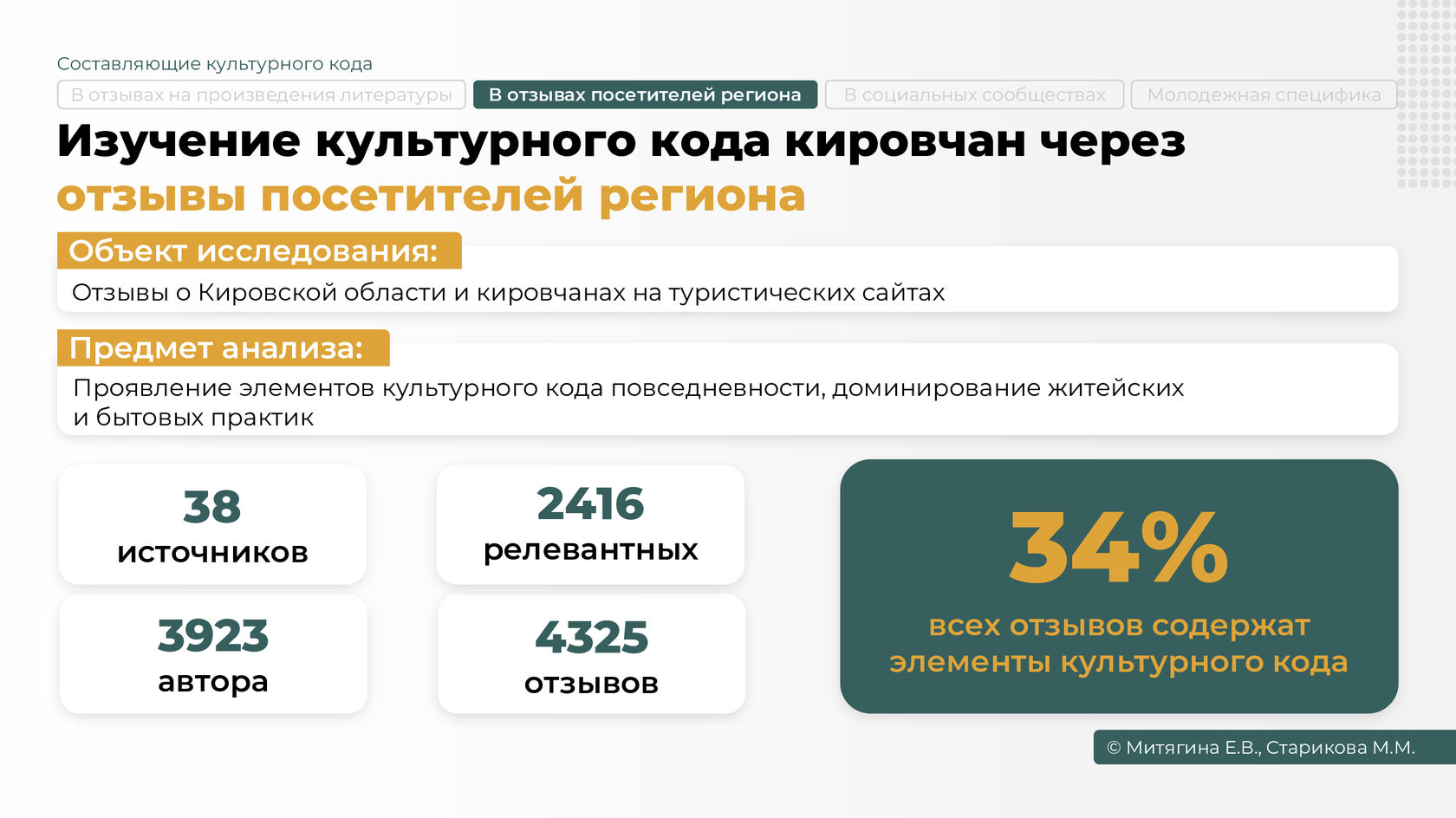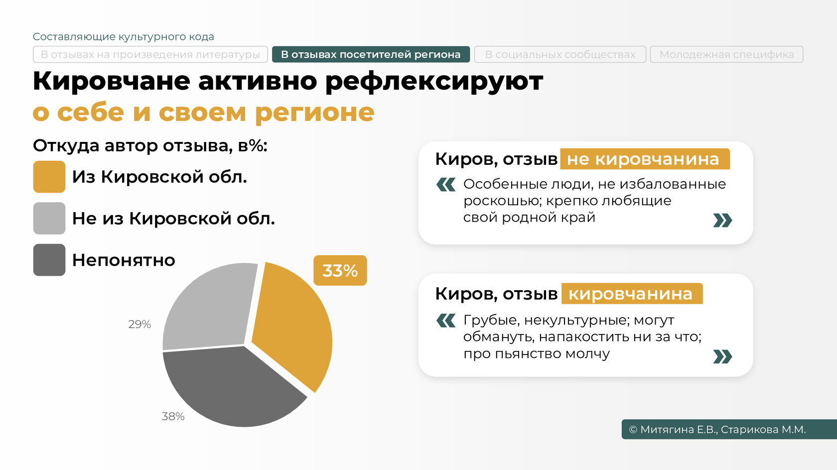 Команда проекта проанализировала отзывы о Кировской области и кировчанах, оставленные гостями и самими жителями региона на 38 туристических сайтах. Речь идет о 4325 комментариях, позволивших изучить проявление элементов культурного кода повседневности, доминирование житейских и бытовых практик кировчан и создать обобщенный портрет жителя региона.