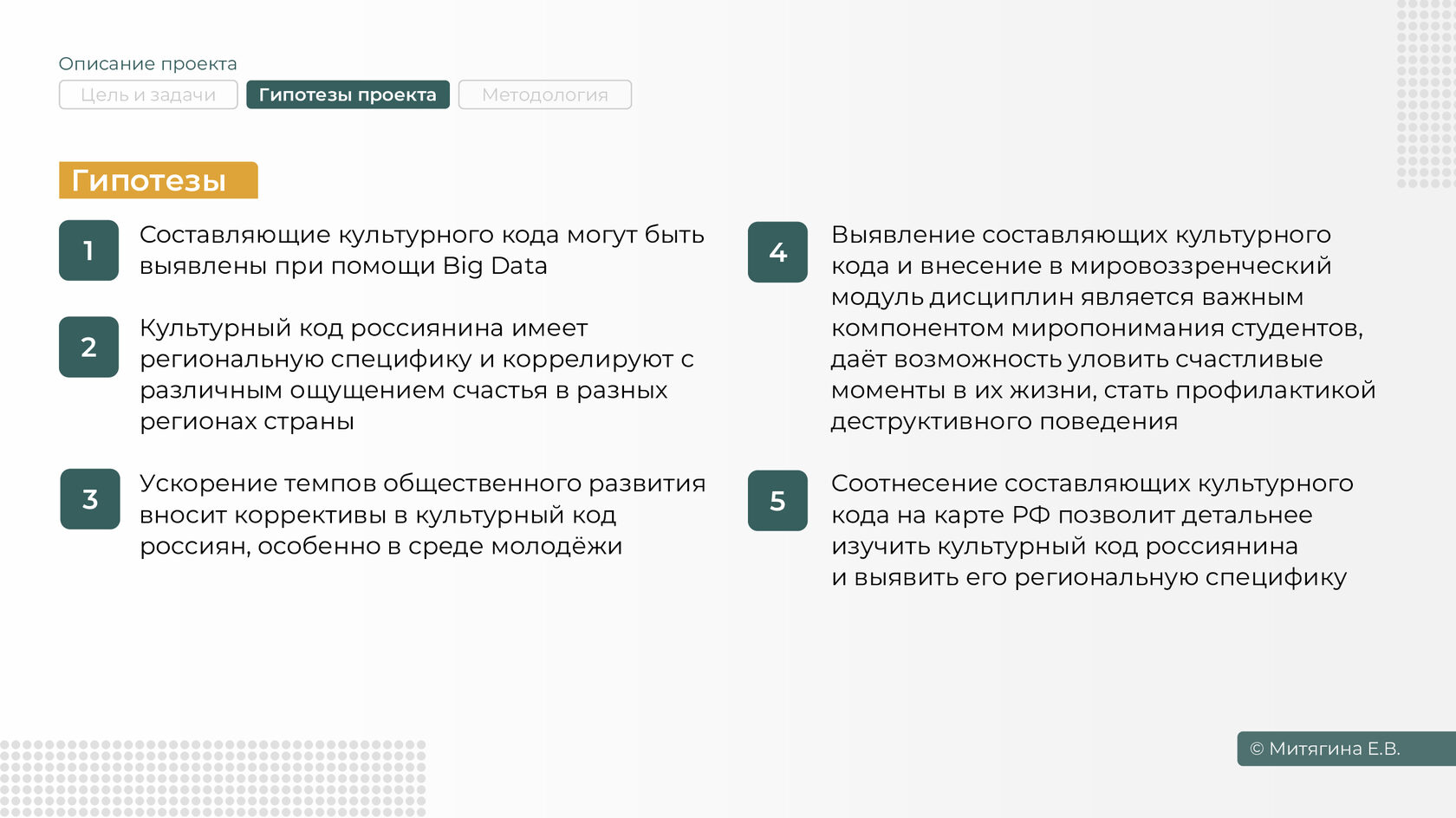 Большой объем работы уже проведен в рамках стратпроекта «Гармоничная личность», одной из важнейших составляющих которого стал проект «Культурный код россиянина». Он, в свою очередь, включает ряд блоков, среди которых исследование культурного кода кировчанина. Основная часть работы по региональной теме проводится руководителем центра прикладного анализа данных ВятГУ Екатериной Митягиной и доцентом кафедры культурологии, социологии и философии Марией Стариковой.