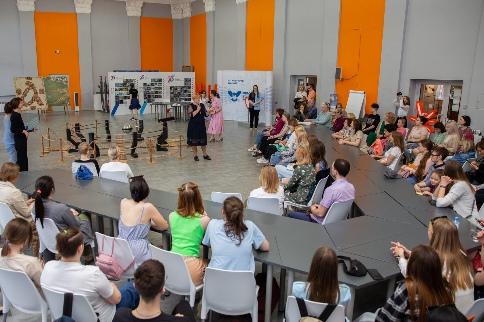 9 июня «Точка кипения» вновь стала площадкой праздника, распахнув двери для участников и гостей фестиваля и мероприятия ИЦАЭ OPEN. Большую программу открыла выставка «Вятские буки», организованная в сотрудничестве с историческим клубом «Мир». Зрителям были представлены удивительные арт-объекты, среди которых «Древо русской письменности» и «Вятский музей азбуки». Гости события попробовали свои силы в уникальной настольной игре «Вятские буки», созданной художником Андреем Драченковым совместно со студентами-культурологами ВятГУ. Кроме того, все желающие стали участниками увлекательного мастер-класса по каллиграфии. Экспонаты выставки останутся в актовом зале еще несколько дней – воспользуйтесь возможностью ознакомиться с ними!